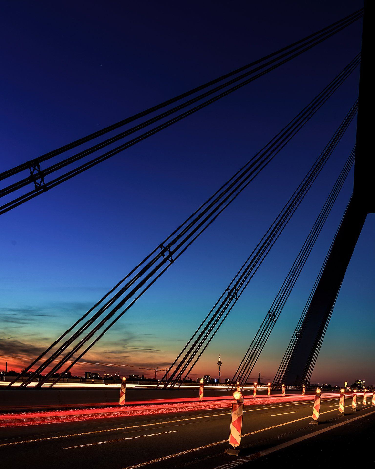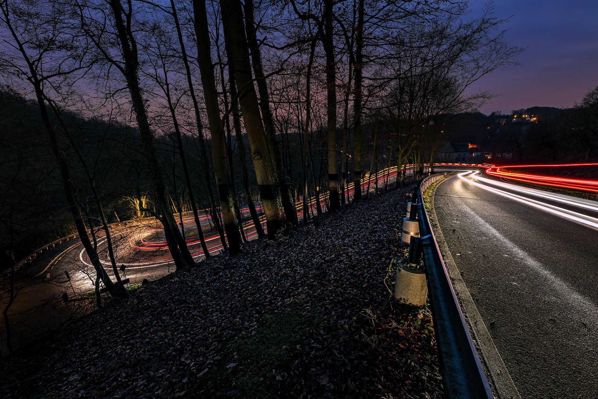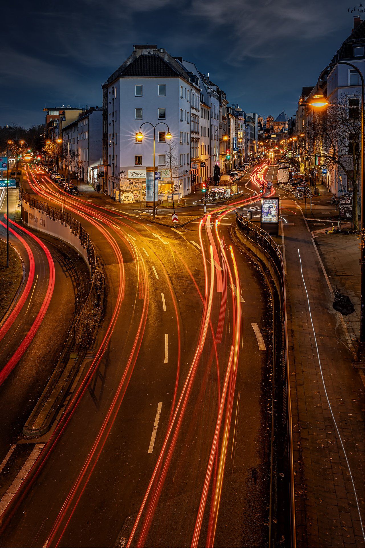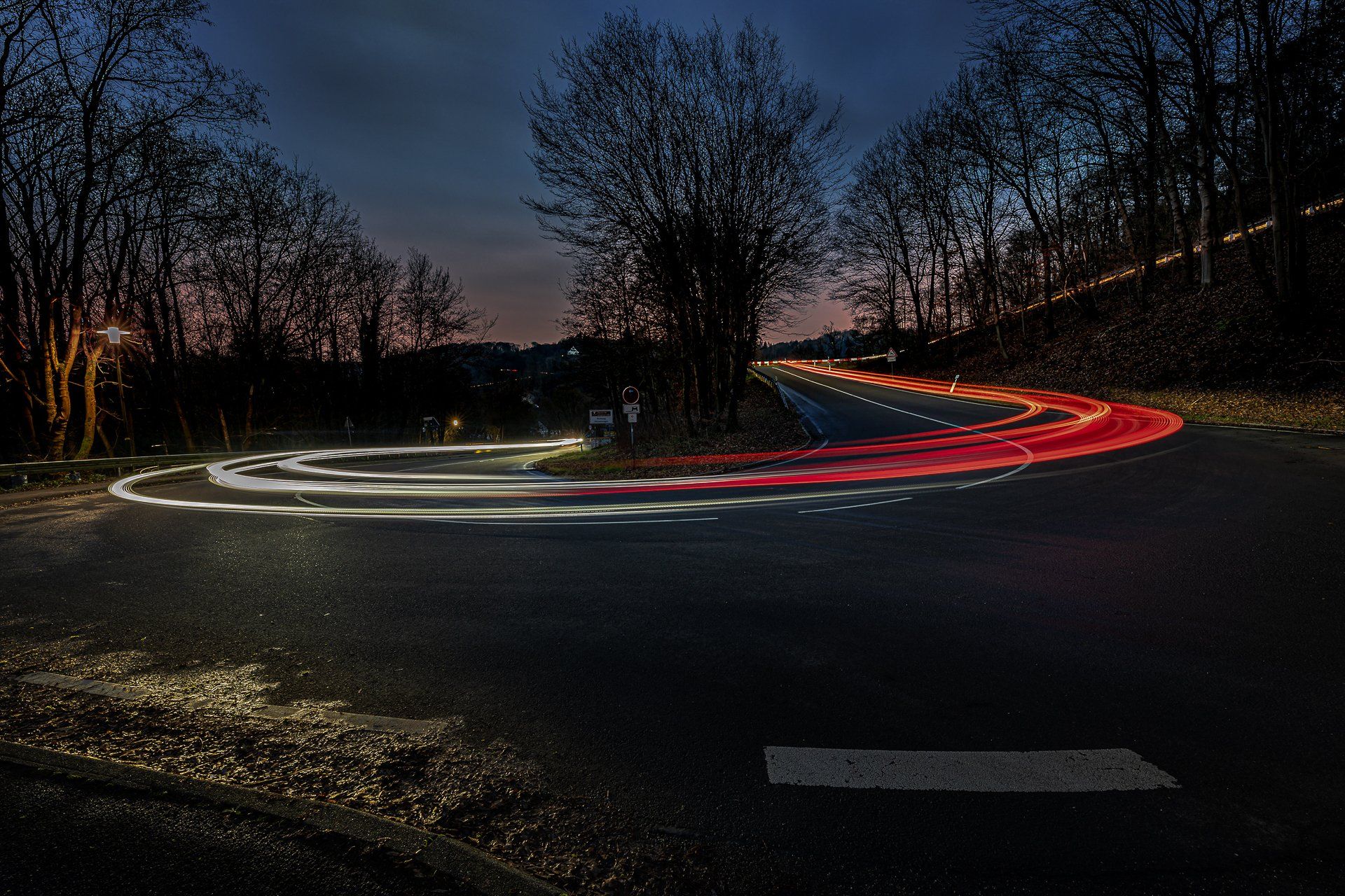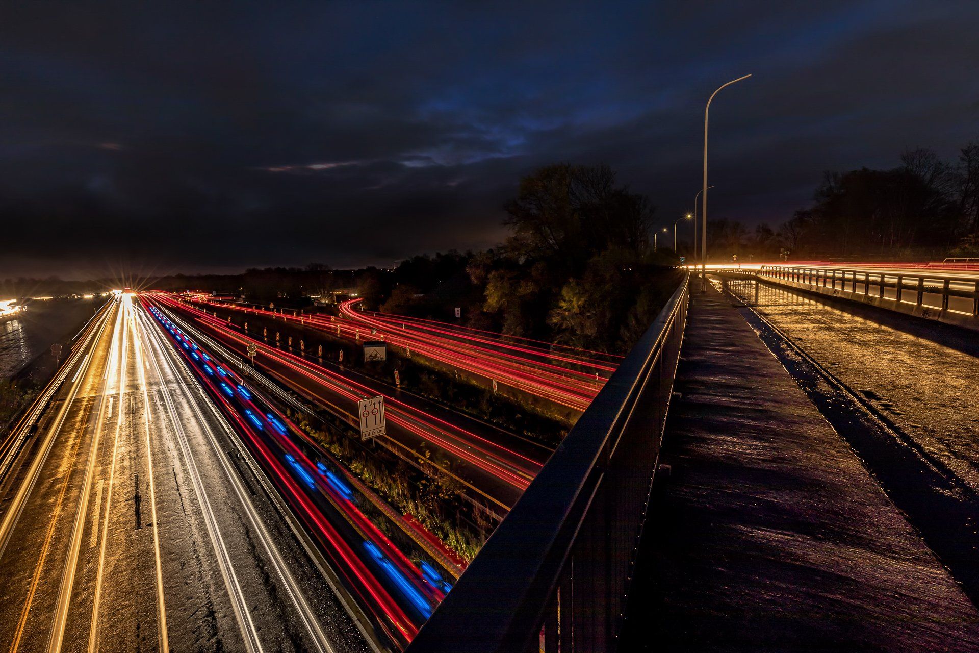 Der Ursprung in meiner Fotografie von Lichtspuren, also der Langzeitbelichtung von sich bewegenden Fahrzeugen, findet sich in der Bildidee, das Autobahnkreuz Monheim Süd mit all seinen befahrenden Spuren zu fotografieren. Diese Idee hatte ich im April 2020, da es aber eher ein weniger befahrenes Autobahnkreuz ist und ich alle Fahrspuren befahren haben wollte musste ich warten bis es zur Rushhour dunkel genug war, um die Langzeitbelichtung auf zu nehmen. Im Dezember 2020 entstand dann mein erstes geplantes Lichtspurenbild. Die Planung, Durchführung und Bearbeitung am Rechner machte mir soviel Spaß, dass ich immer häufiger loszog, um Lichtspuren zu knipsen. Eine schöne Beschäftigung für Herbst & Winter!