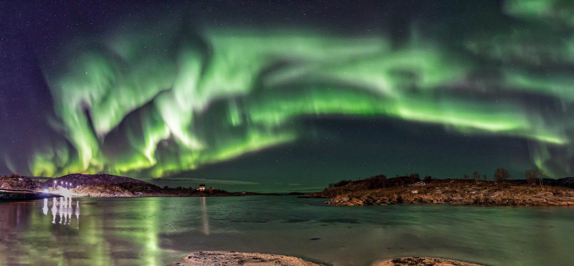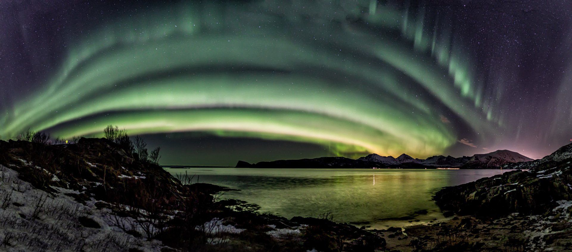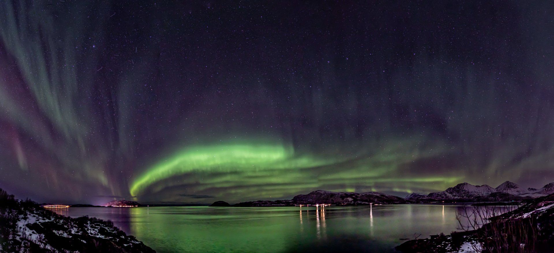 Selbst Panoramen können die wahre Größe der Polarlichter nicht in ihrer gänze darstellen. Ich hoffe ich kann Euch einen kleinen Eindruck der Dimensionen geben! Bei geringer Intensität sahen wir einen einfachen, sich langsam bewegenden, grünen Bogen. Bei hoher Intensität starke, schnelle, helle, grüne, gelbe, teils orange Lichter mit lila Rändern und das dunkle des Sternenhimmels wurde dunkel lila!