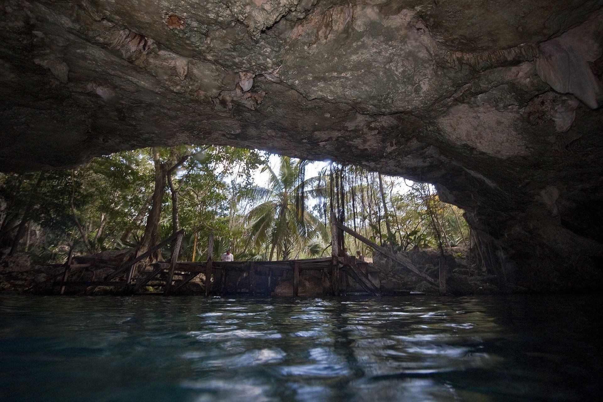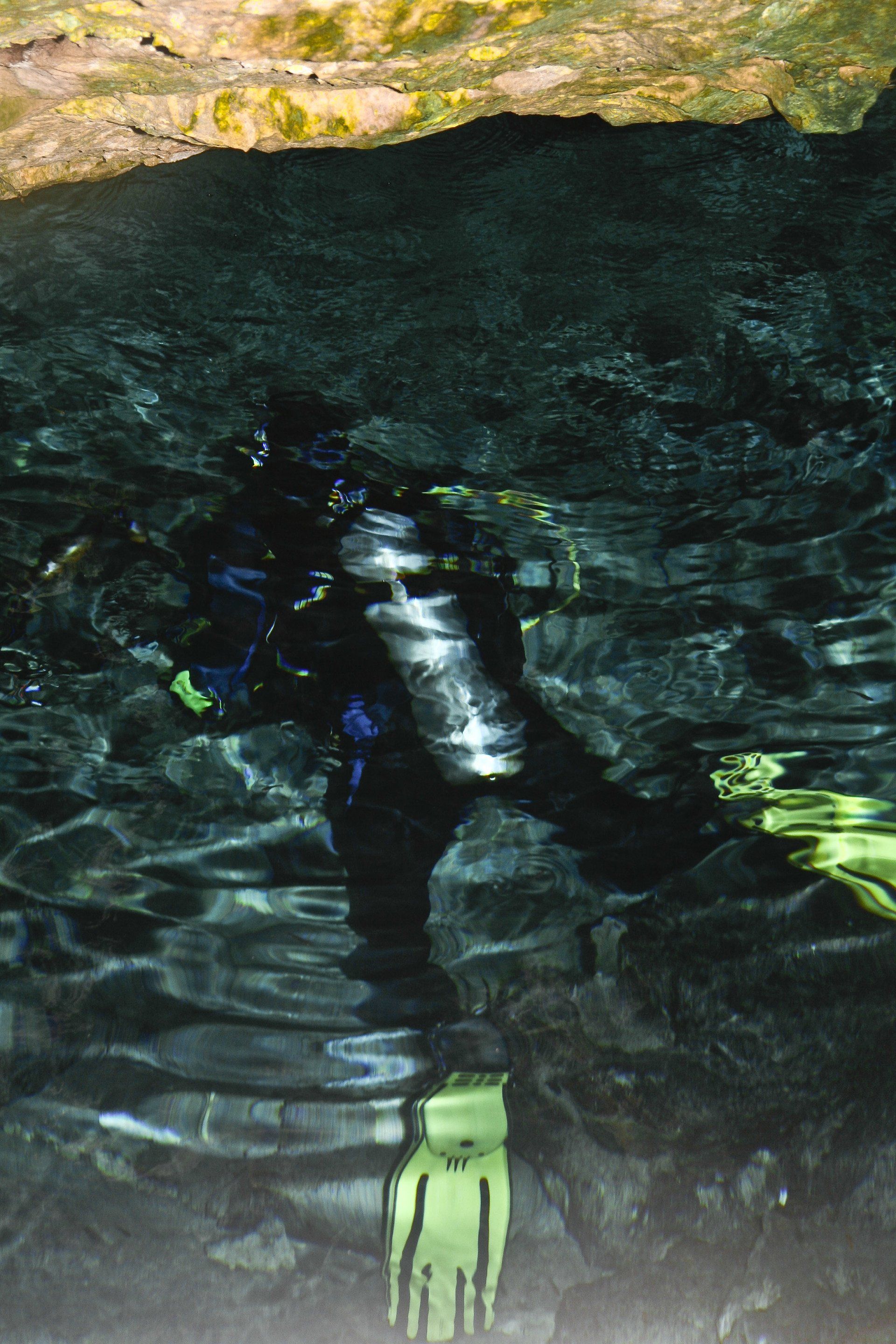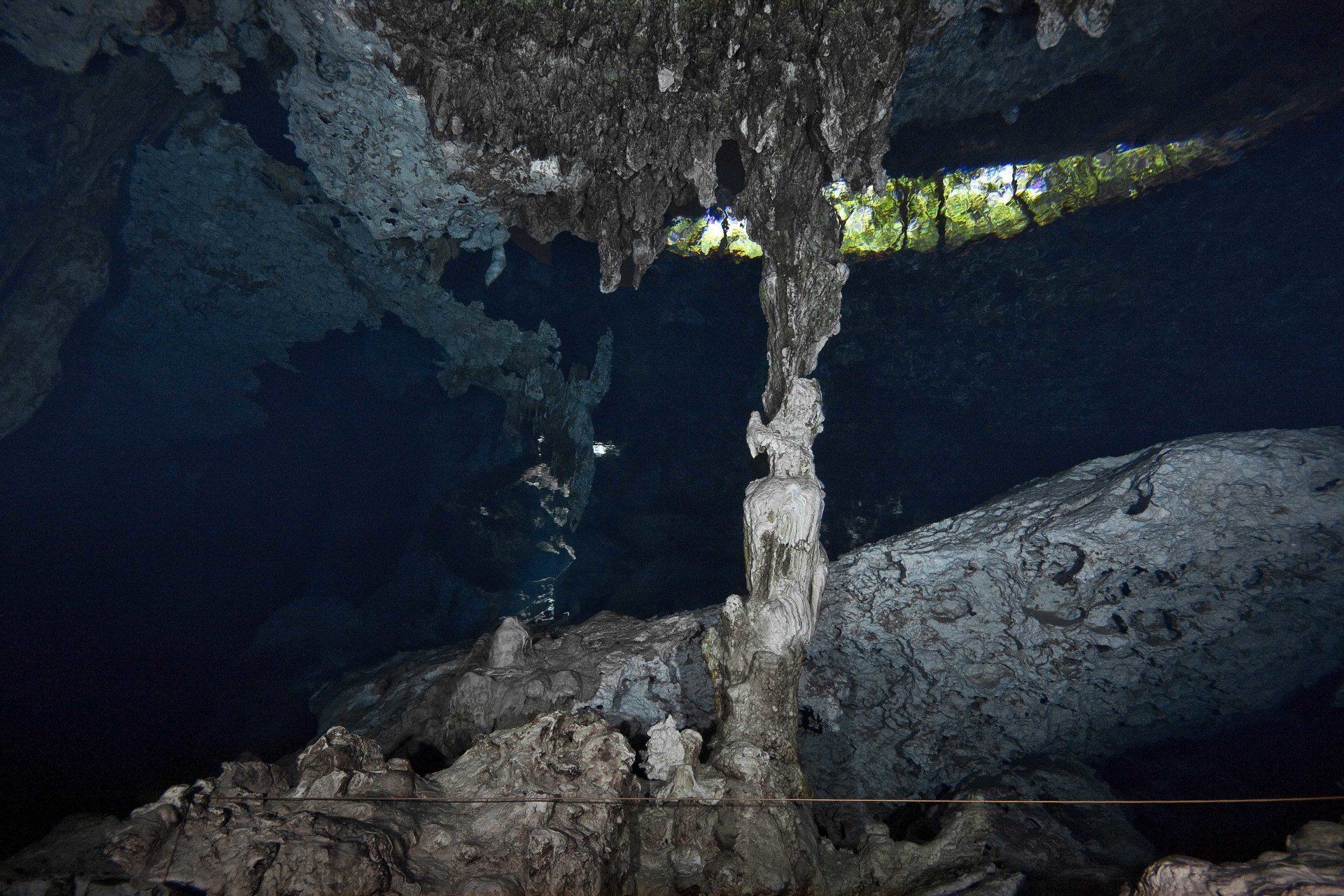 Im Regenwald angekommen erwarteten uns unglaublich klares Wasser, unzählige Stalaktiten und Stalagmiten in allen Größen, Säulen, tolle Felsformationen und irre Lichteinfälle. Die ersten 8m sind mit 24 Grad warmen Süßwasser gefüllt, dann kommt die Halocline, eine ca. bis zu 1m dicke, trübe Sprungschicht aus Süß- und Salzwasser (nicht dass Ihr denkt, ich hätte unscharfe Fotos gemacht, das muss so sein). Unter der Halocline ist dann wieder klares, 26 Grad warmes Salzwasser... Alles zusammen absolute Weltklasse, für mich ein unvergessliches Erlebnis und ein Top-Highlight.
