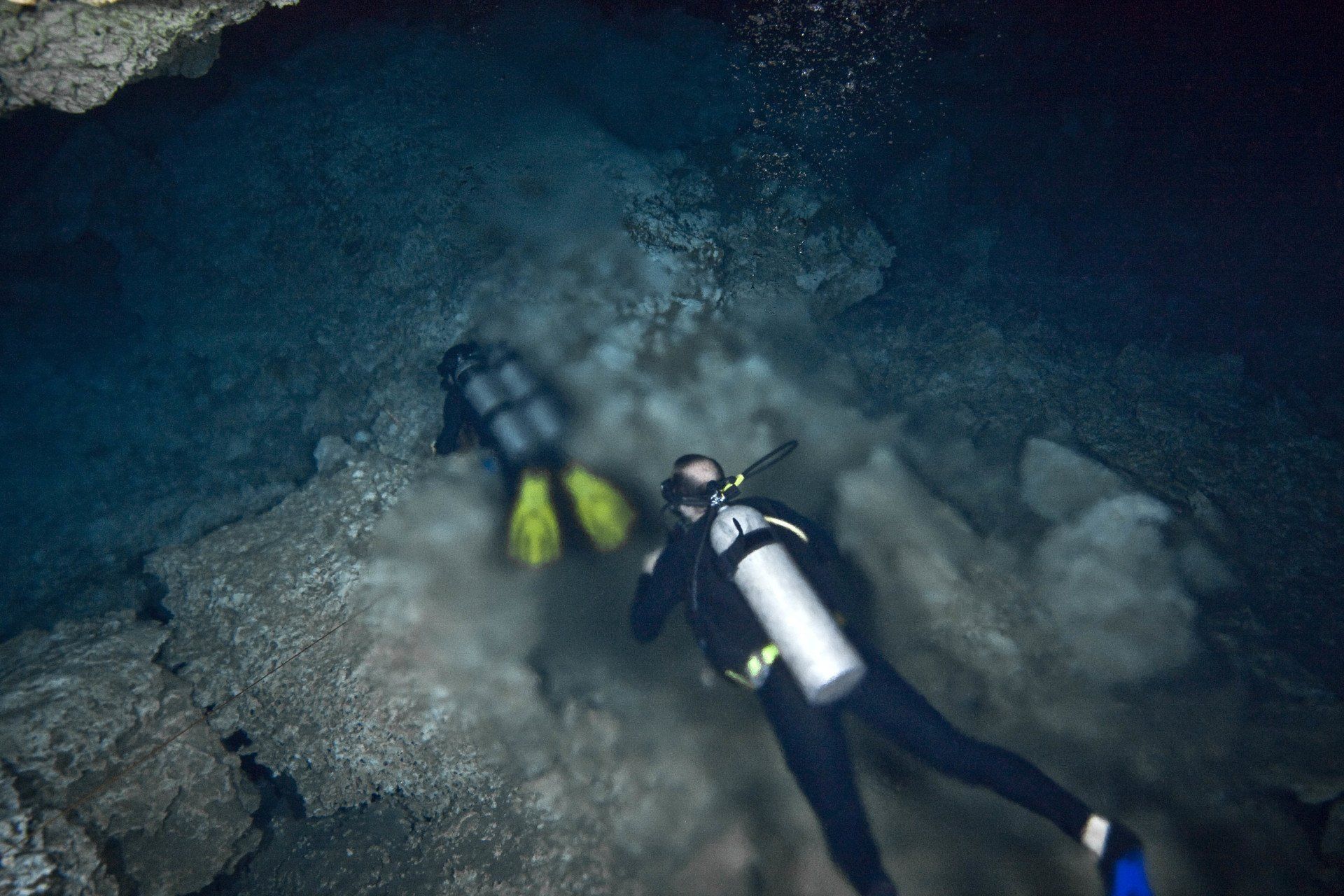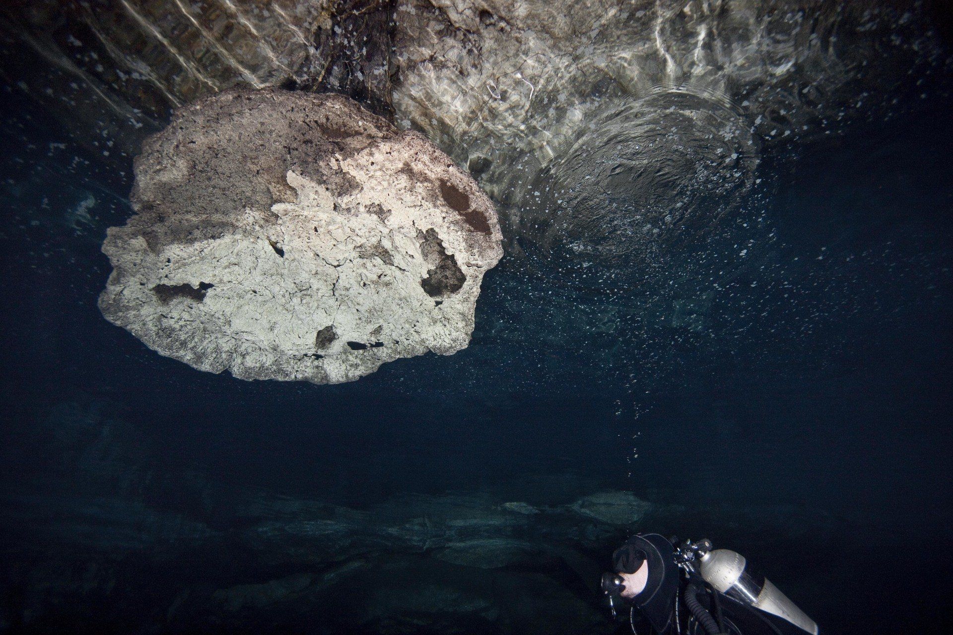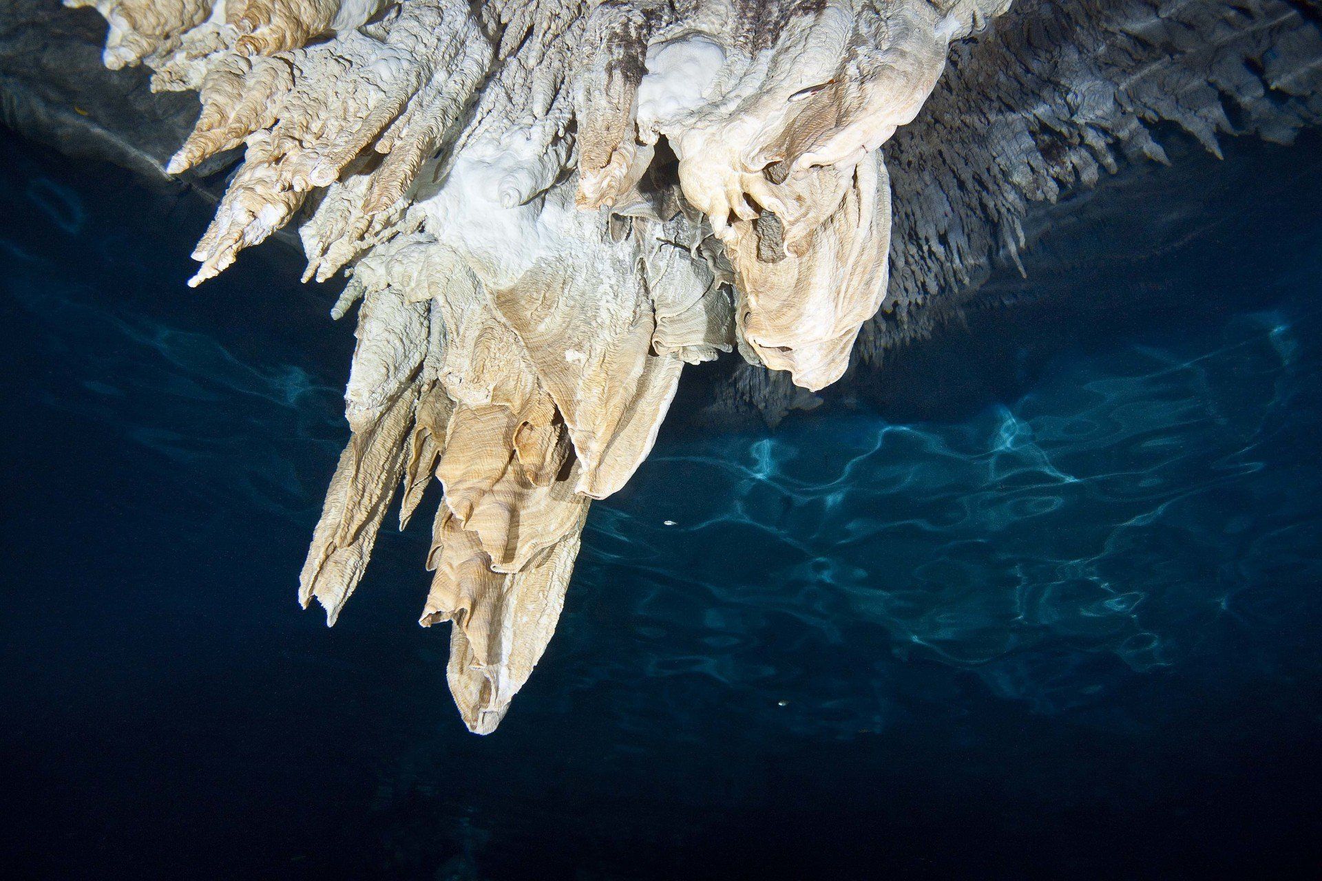 Im Regenwald angekommen erwarteten uns unglaublich klares Wasser, unzählige Stalaktiten und Stalagmiten in allen Größen, Säulen, tolle Felsformationen und irre Lichteinfälle. Die ersten 8m sind mit 24 Grad warmen Süßwasser gefüllt, dann kommt die Halocline, eine ca. bis zu 1m dicke, trübe Sprungschicht aus Süß- und Salzwasser (nicht dass Ihr denkt, ich hätte unscharfe Fotos gemacht, das muss so sein). Unter der Halocline ist dann wieder klares, 26 Grad warmes Salzwasser... Alles zusammen absolute Weltklasse, für mich ein unvergessliches Erlebnis und ein Top-Highlight.