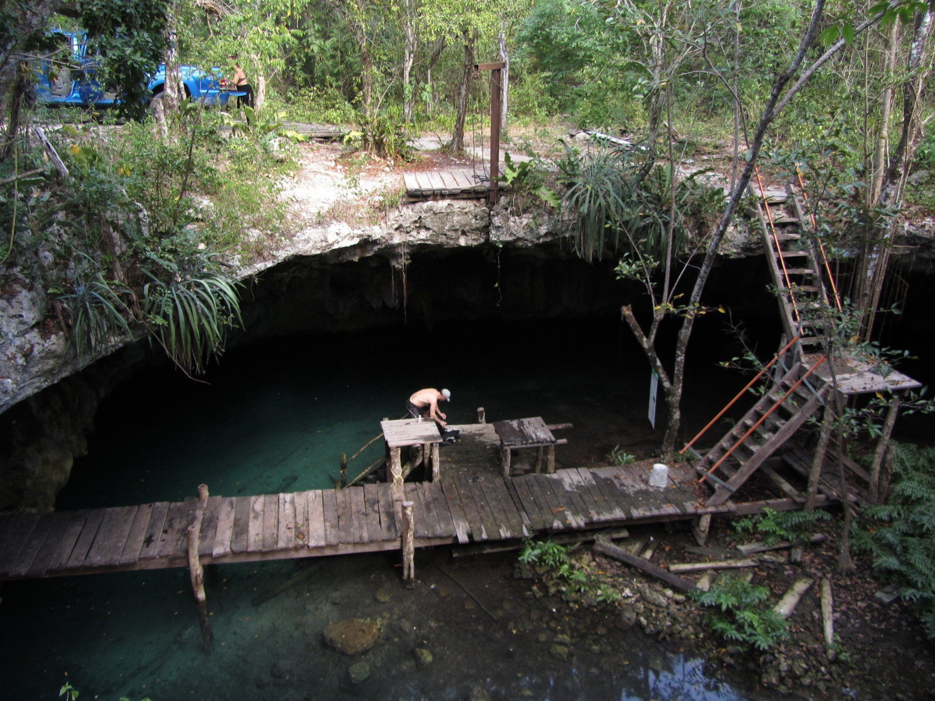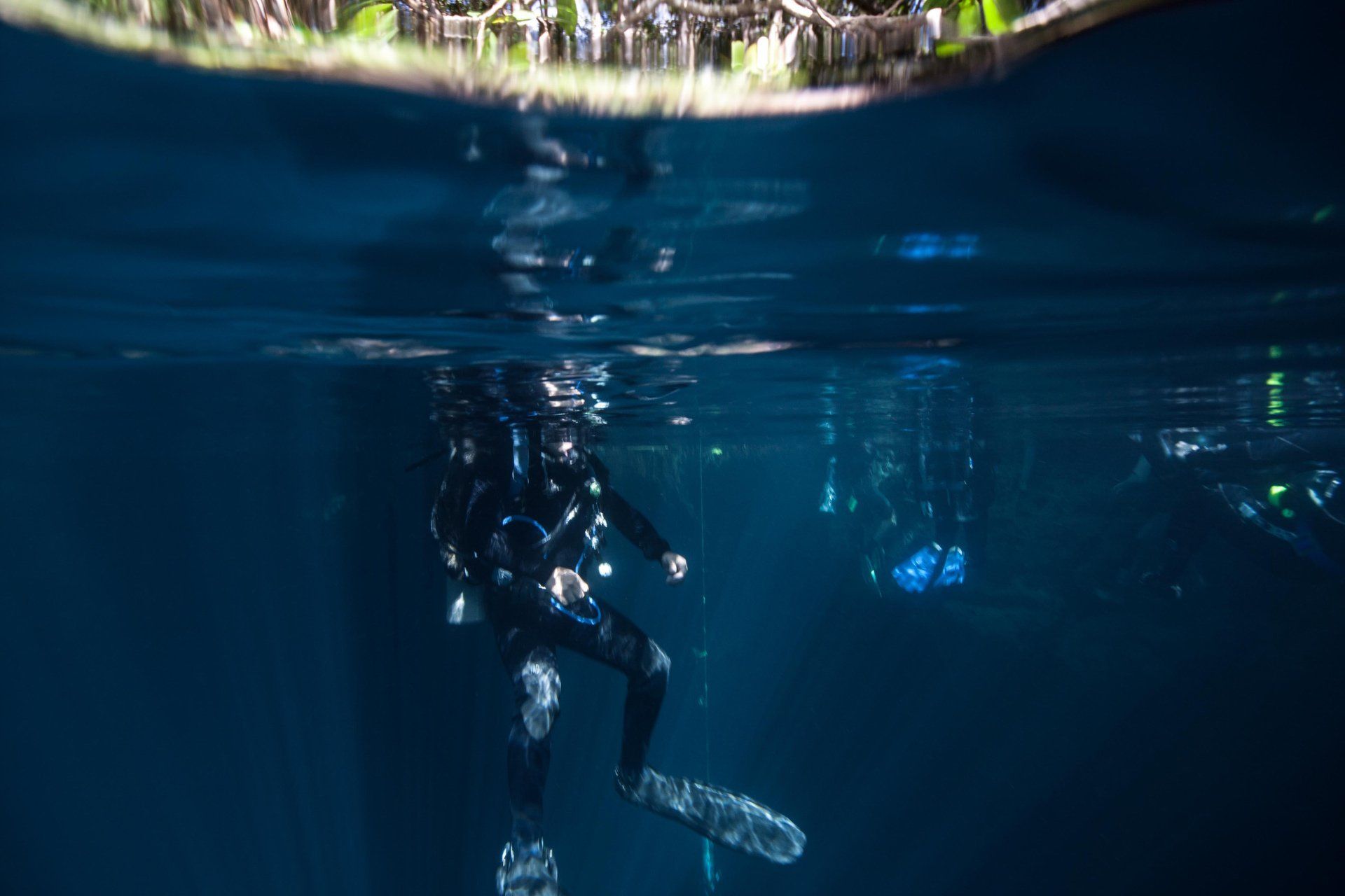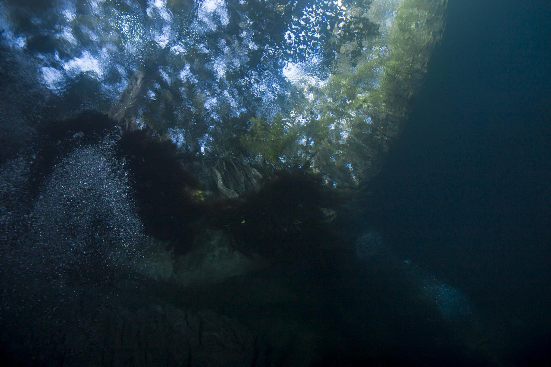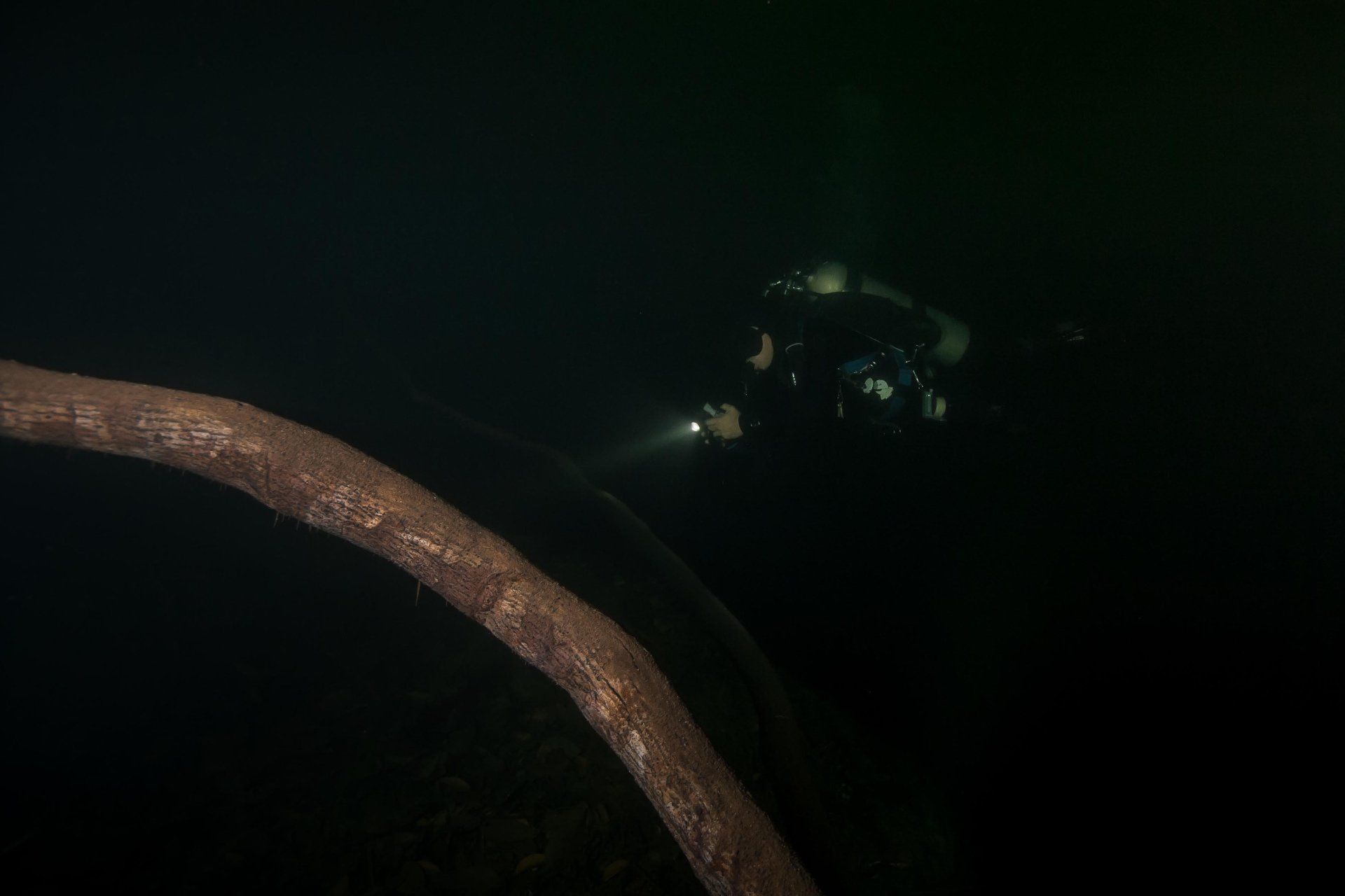 Wieder vertraute ich mich den Höhlentauchern vom Xibalba Dive Center an, die erneut einen tollen Job machten. Kaum angekommen Äußerte ich meine Wünsche und los ging es. Neben den "üblichen" Cenotentauchgängen erwarteten mich diesmal mit den Tauchplätzen "The Pit" und "Angelita" zwei tiefe (110m und 68m) Cenoten, die als Besonderheit eine Schwefelschicht auf ca. 28 Metern aufweisen. Diese trennt das Salz- vom Süßwasser und es ragen tote Bäume, die in die Cenoten gefallen sind, aus ihnen heraus... eine absolut gespenstige Kulisse mit toller Lichtstimmung. Es schaut aus, als ob man über einem See schwebt, der ans Ufer mit Bäumen plätschert. Unter der Schwefelschicht ist es fast dunkel und erinnert doch sehr an unsere Baggerseen. Die Sichtweite ist aber so gut wie die Lampe reicht. Nach dem tollen Dive in "Angelita" fuhren wir nach "Carwash", einem kleinem See mit Cenote ohne Führungleinen. Dieser Tauchplatz wird zum Training bei Höhlentauchkursen genutzt. Die Höhle selbst fand ich nicht so spektakulär, dafür bot sich mir aber ein absolut grandioser Ausblick aus der Höhle in den sonnendurchfluteten See mit seinem glasklarem Wasser, toten Bäumen, blauem Himmel, weißen Wolken, massenweise gebündelte Lichtstrahlen, Seerosen, Fischen, Schildkröten und meinem ersten Krokodil. Nicht sehr groß, ca. 1,5m, aber nur eine Armlänge von mir entfernt... Klasse... einer meiner besten Tauchtage der letzten Jahre.