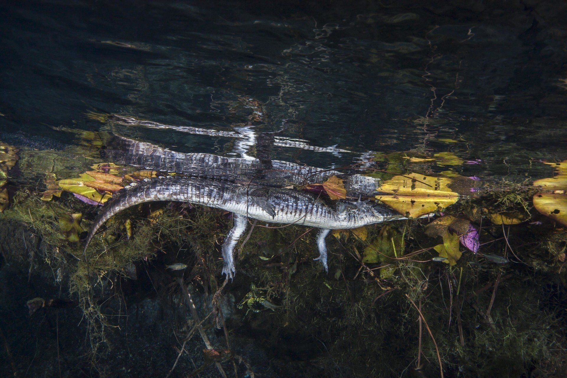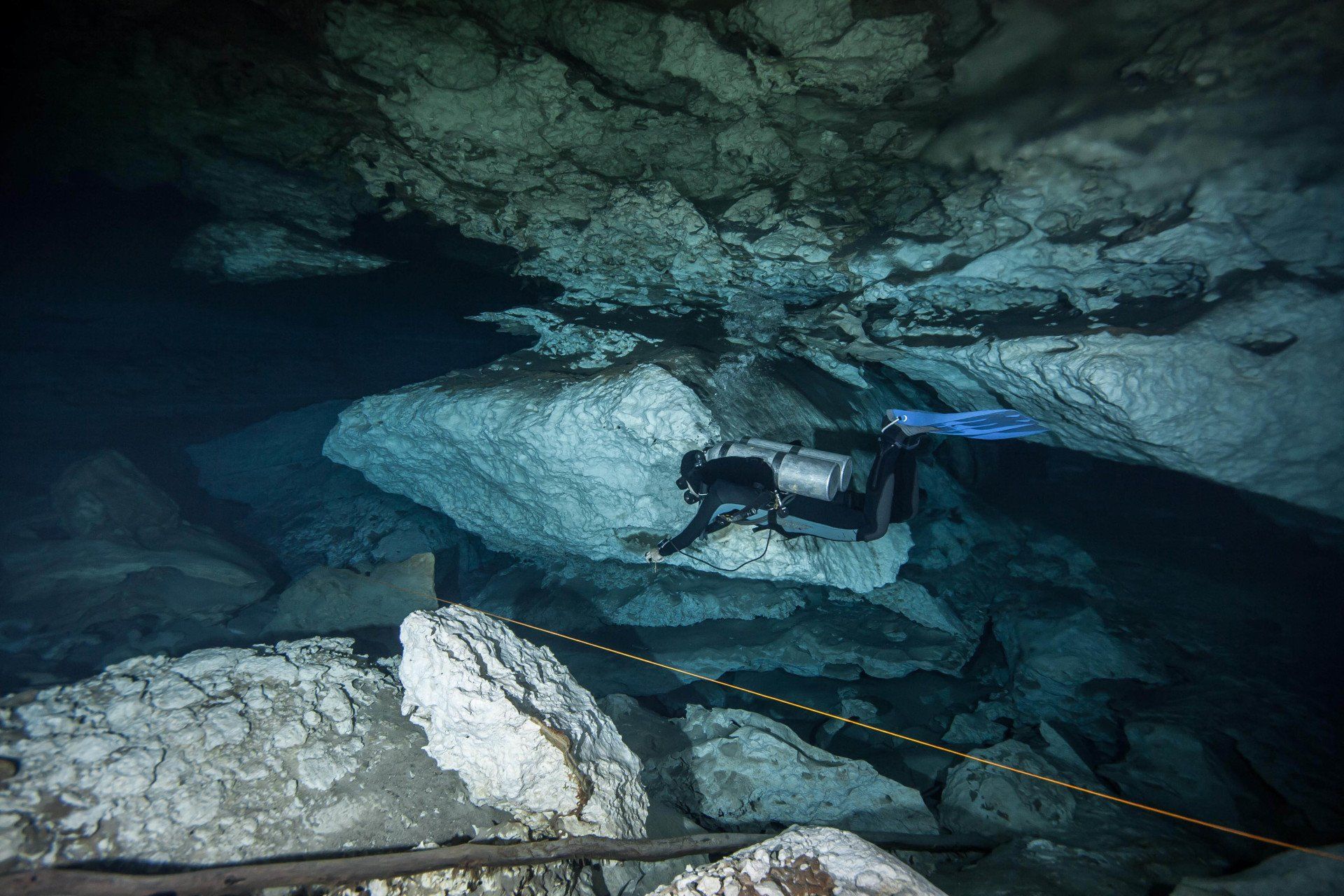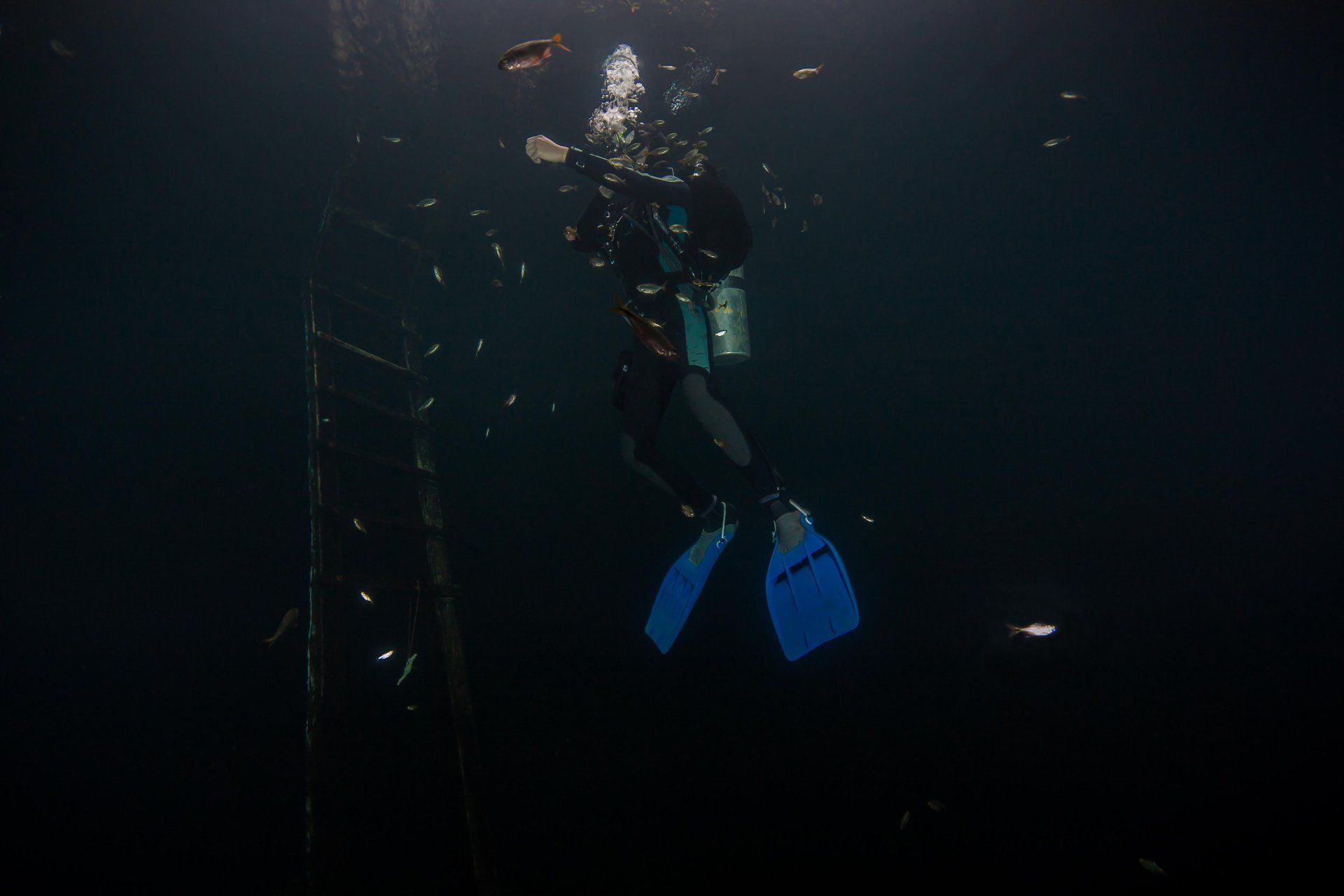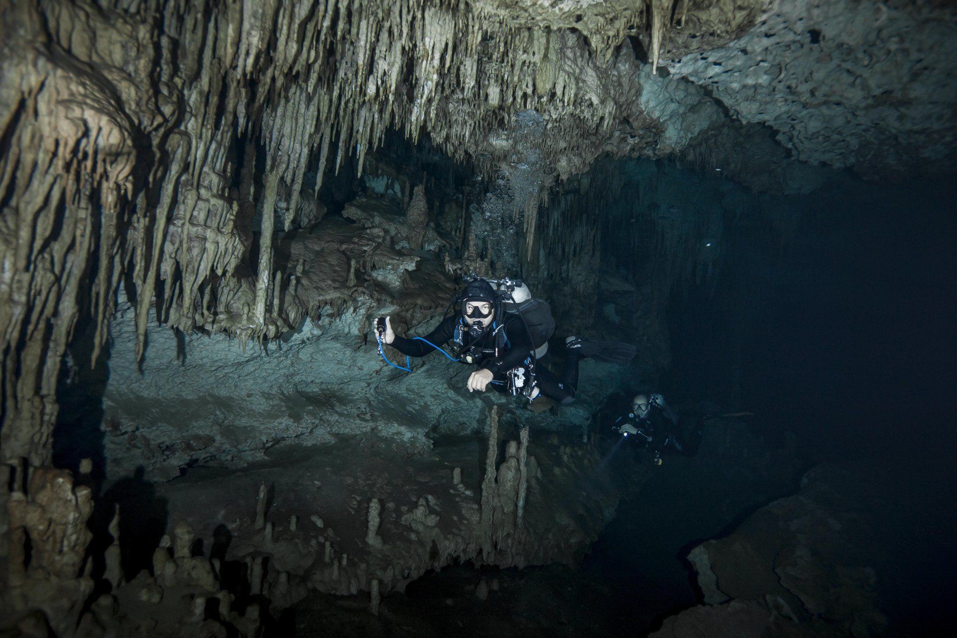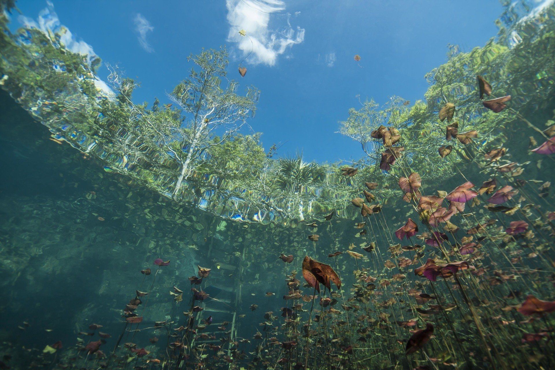 Wieder vertraute ich mich den Höhlentauchern vom Xibalba Dive Center an, die erneut einen tollen Job machten. Kaum angekommen Äußerte ich meine Wünsche und los ging es. Neben den "üblichen" Cenotentauchgängen erwarteten mich diesmal mit den Tauchplätzen "The Pit" und "Angelita" zwei tiefe (110m und 68m) Cenoten, die als Besonderheit eine Schwefelschicht auf ca. 28 Metern aufweisen. Diese trennt das Salz- vom Süßwasser und es ragen tote Bäume, die in die Cenoten gefallen sind, aus ihnen heraus... eine absolut gespenstige Kulisse mit toller Lichtstimmung. Es schaut aus, als ob man über einem See schwebt, der ans Ufer mit Bäumen plätschert. Unter der Schwefelschicht ist es fast dunkel und erinnert doch sehr an unsere Baggerseen. Die Sichtweite ist aber so gut wie die Lampe reicht. Nach dem tollen Dive in "Angelita" fuhren wir nach "Carwash", einem kleinem See mit Cenote ohne Führungleinen. Dieser Tauchplatz wird zum Training bei Höhlentauchkursen genutzt. Die Höhle selbst fand ich nicht so spektakulär, dafür bot sich mir aber ein absolut grandioser Ausblick aus der Höhle in den sonnendurchfluteten See mit seinem glasklarem Wasser, toten Bäumen, blauem Himmel, weißen Wolken, massenweise gebündelte Lichtstrahlen, Seerosen, Fischen, Schildkröten und meinem ersten Krokodil. Nicht sehr groß, ca. 1,5m, aber nur eine Armlänge von mir entfernt... Klasse... einer meiner besten Tauchtage der letzten Jahre.